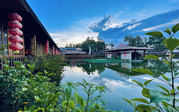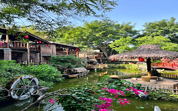 园区依山傍水,融合岭南客家水乡文化、生态田园、红色文化和国画产业,设有度假酒店、乡村温泉、水上乐园、开心游乐园四大主体版块,兼具自然风光与文化体验。