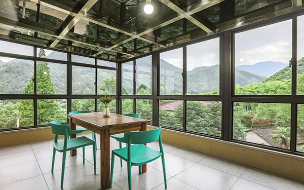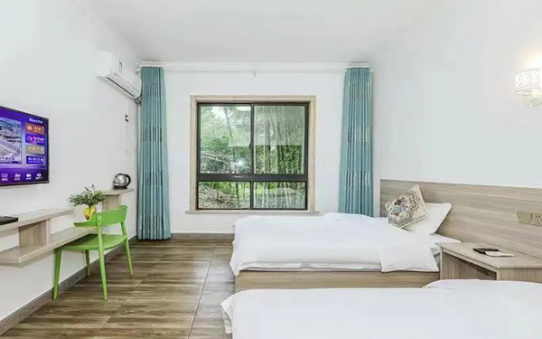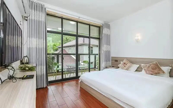 1.住宿条件舒适:山庄是一栋四层别墅,有 15 间不同规格的客房,可同时容纳 30 人入住,房间舒适明亮,均配备空调、液晶电视、无线网、独立卫生间等设施,宽大的落地窗设计让游客可以更好地欣赏远方的秀美景色,且每间客房都配备了一个超大的露台。
