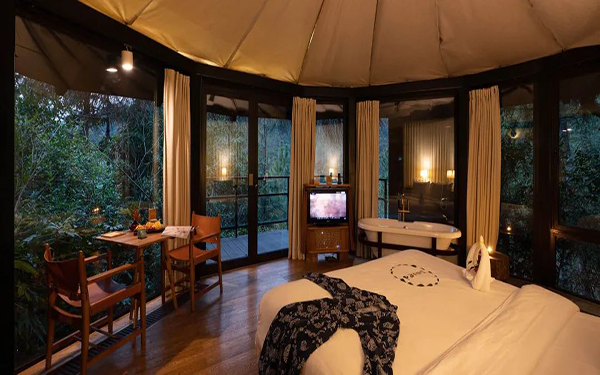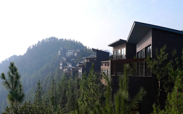 2.建筑设计独特:拥有 30 栋树顶别墅和 40 栋夯土小屋,是中国首个获得美国绿色建筑协会 LEED 国际建筑铂金级认证的高端度假村。树顶别墅悬于 10 多米高的树顶,被钢架底座托起,可俯瞰群山翠竹;夯土小屋宁静浪漫,与自然环境融为一体。