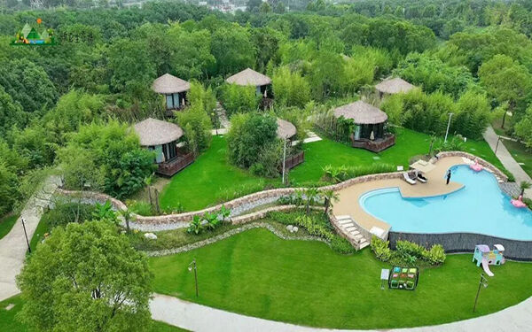酒店位于常州新龙生态林腹地,占地12万平方米,周边440公顷的生态林环绕,形成“水上栖居”与“江南古村”交融的独特景观。客房依水而建,茅草屋、帐篷房等特色房型临水而居,可近距离欣赏湿地水系、色叶林和水杉林,营造出“生态高地·自然栖居”的氛围。