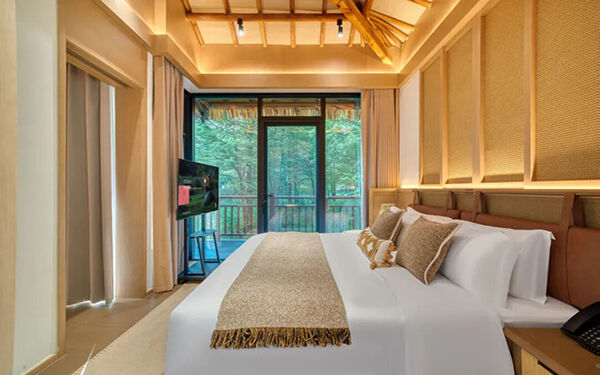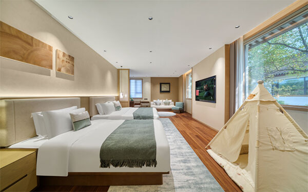 配备童玩天地、露天森林泳吧、宠物专属通道和休息区,满足家庭度假需求。儿童可在藏乐空间体验垂钓、攀爬等游戏,宠物也能享受专属服务,适合全家出行。