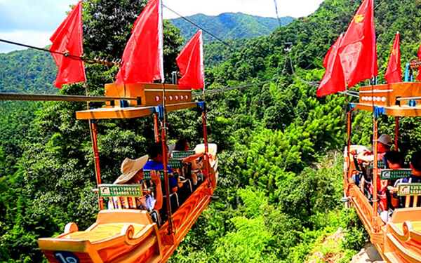 400 多米长、高达 170 多米的空中索道横跨两座山峰,游客乘坐特制 "飞艇" 在高空滑行,脚下是郁郁青青的千亩竹海和翠竹林海,可 360 度俯瞰德寿山全景,体验 "笑傲山林" 的刺激与壮阔。此项目为景区必体验项目。