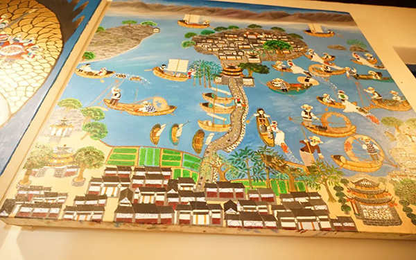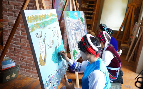 “小双娘”赵新莲介绍说,她画中的配色也是来源于年轻时候就擅长做的刺绣,刺绣的时候如何搭配颜色,画中便怎么去调和。以曾经划船时划起的水花为天然画稿,把色彩意境揉进熟悉的传统白族纹样中……在这里,捏泥塑、剪窗花、纺麻线这些农闲手艺,都成了艺术创作的基石。对她们而言,艺术不在“天上”,而在烧火做饭、穿针引线的日子里。