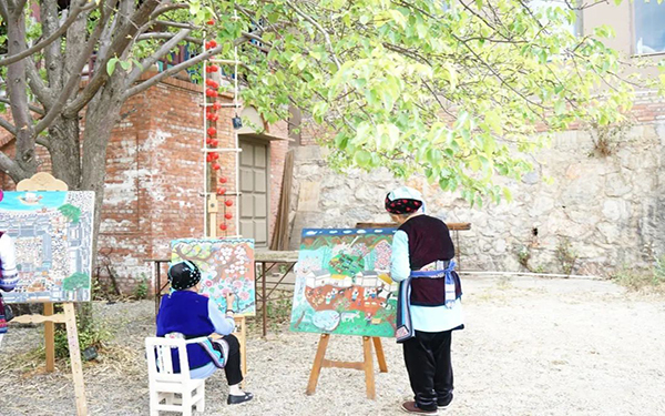 画社的另外几位成员坐在一旁,在各自画架前静静描摹着,共执画笔的场景,勾勒出乡土文化在当代的鲜活脉络……