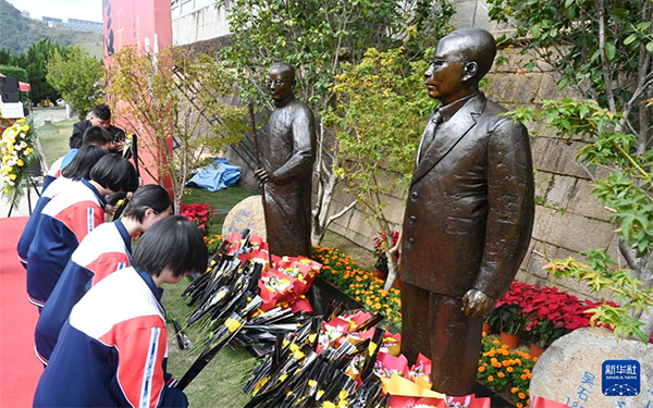 11月15日,学生向何遂、吴石雕像献花。