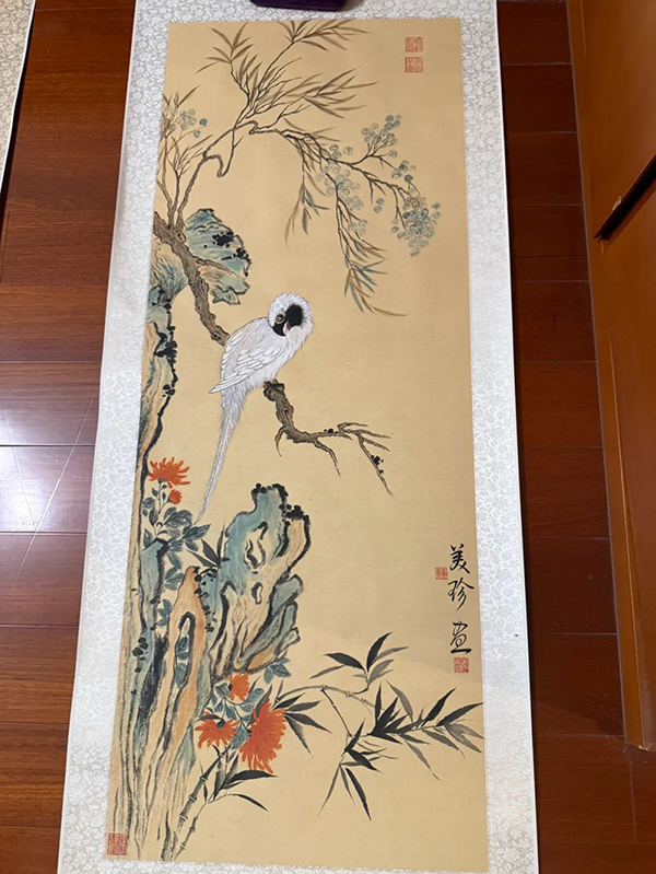 李美珍实现“画画自由”,是1999年从单位退休后。空余时间多了,想乘闲暇时间学习中国绘画艺术,在丈夫的支持下,走进了上海师范大学学习中国画,一学就是十几年。这段时间里,从家里到学校两点一线,始终坚持听课学习,不管是酷暑盛夏还是寒冬腊月,漫长的日日夜夜里始终坚持绘画,仔细揣摩历代经典画作,有时一幅画要画上几天甚至一个星期。经过系统学习,李美珍对画画也有了更深的理解,技艺日渐长进。在别人眼里看似辛苦,她却乐在其中,从一开始的消磨时光变为了心头挚爱。由于兴趣爱好加上个人努力,终于修成“正果”,十几年里大约画了上百幅花鸟山水画,临摹作品得到教授老师的肯定和赞扬,书画作品入选“首届上海老年大学系统书画联展”。