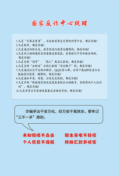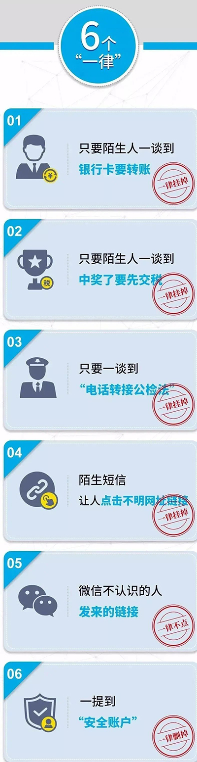 提高警惕,增强个人防范意识,预防各种类型的诈骗,请大家牢记以下反诈骗口诀: